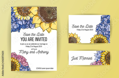 Set Of Wedding Invitation Card With Flowers Of Hydrangea And Sunflower A5 Wedding Invitation Design Template On White Background Natural Cards Design Template Save The Date Cards In Wedding Suite Buy