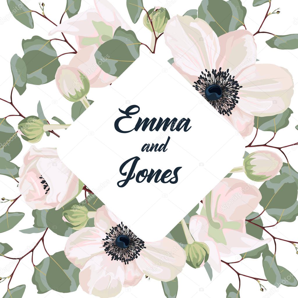 Wedding Floral Hand Drawn Invite Invitation Card Design Eucalyptus Silver Pink Anemones Greenery Natural Leaves Watercolor Rustic Elegant Delicate Green Beauty Cute Template Premium Vector In Adobe Illustrator Ai Ai