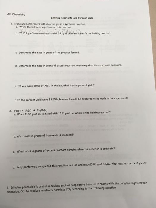 limiting reactant and percent yield answers